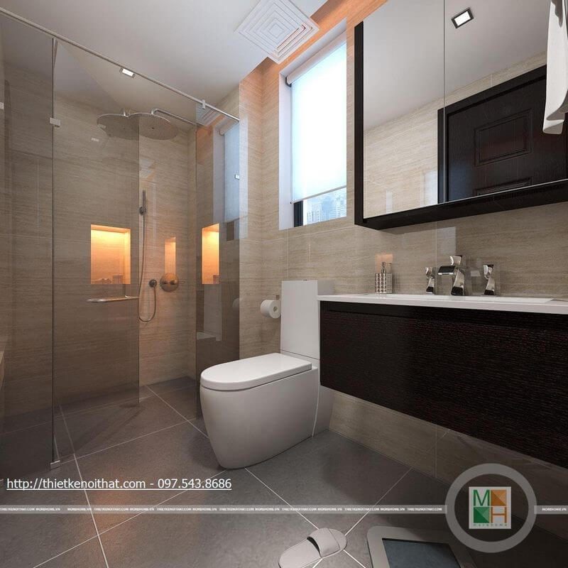 Mẫu thiết kế nội thất phòng tắm hiện đại được tạo nên bởi sự kết hợp của nội thất và thiết bị vệ sinh hiện đại, màu gạch be ốp tường và các chi tiết nhỏ cuốn hút mọi ánh nhìn.
